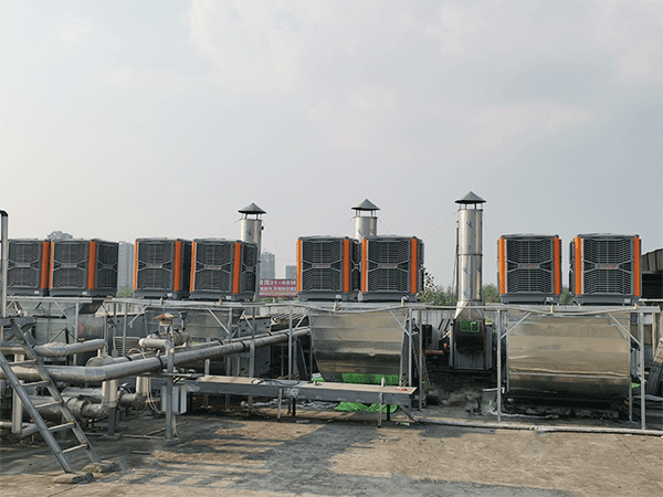 该次降温工程为玻璃架制作车间,厂房结构是钢结构,高15m,面积约5000㎡。人员分布比较散。夏季车间的温度通常都在35℃以上,在外部气温高时,可达40℃。工作时,因烘焊产生的烟雾,切割产生的火花,异味非常重,空气不流通,闷热,影响了员工的工作情绪及增加了招聘难度。
